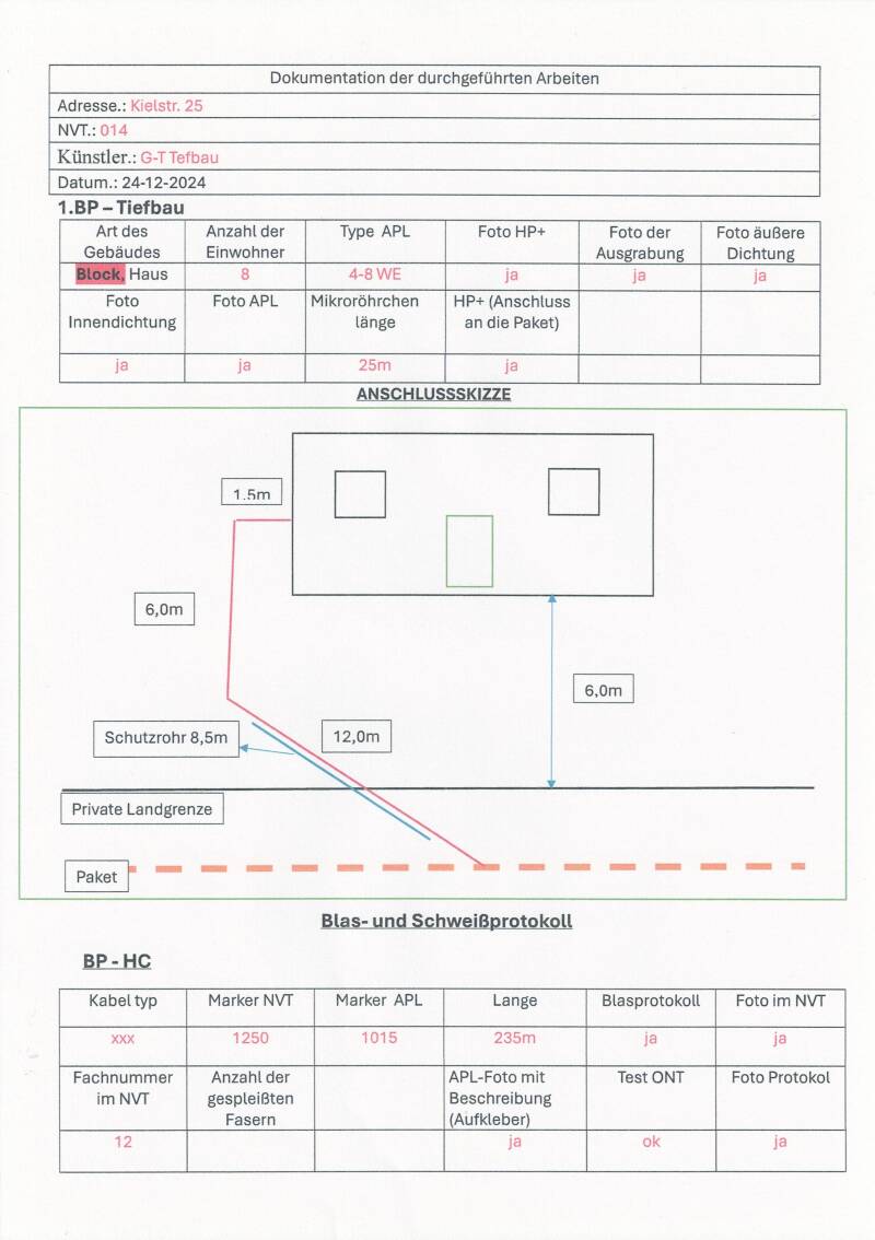 Ein wesentlicher Bestandteil jeder Verbindung ist die Erstellung einer entsprechenden Dokumentation. Die Form der Erstellung einer Skizze mit Beschreibung und Fotodokumentation hängt von den Anforderungen des Investors an ein bestimmtes Projekt ab. Wir bewahren die Originale in der Buchhaltung auf und senden dem Kunden in täglichen Berichten eine Kopie.